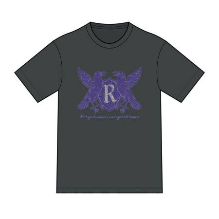 26.00 USD A lightweight, lived-in tee stamped with quiet rebelliousness and a touch of bookish magic. The charcoal body carries a hand-drawn twin raven crest, where two winged ravens mirror each other around a vintage-style weathered โR.โ The print is a soft, distressed royal-violet blue, the kind of color that feels like it has survived…