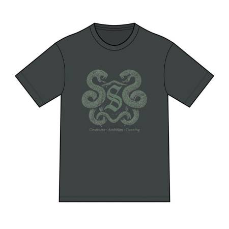 20.74 USD A lightweight, lived-in tee with a quiet, confident edge. The charcoal fabric carries a hand-drawn Twin Serpents Crest, where two mirrored snakes coil around a weathered Gothic โS.โ The distressed dark-jade print feels like itโs traveled through candlelit corridors, hidden libraries, and a few rule-bending nights. Beneath the emblem, a short script line…