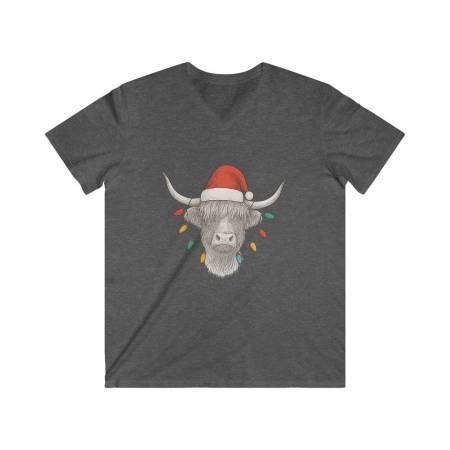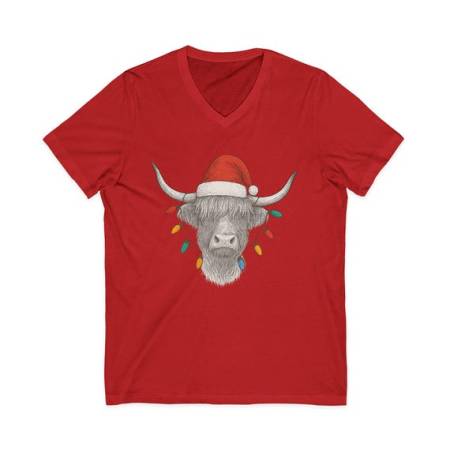 Highland Cow with Santa Hat and Christmas Lights Tee | V-Neck Shirt by ShoobeeCreations